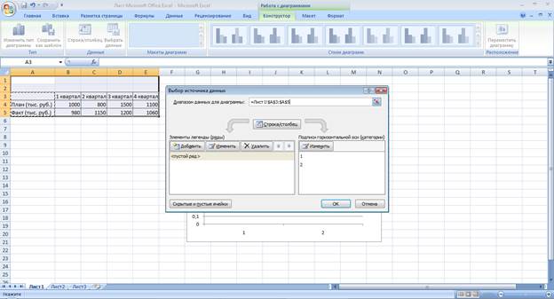 Для удаления диаграммы достаточно выделить ее и нажать клавишу Delete. 2. После создания диаграммы можно изменить диапазон данных, представленных на диаграмме. В группе Диапазон вкладки Работа с диаграммами/Конструктор нажмите кнопку Выбрать данные. Создайте копию своей диаграммы. В окне Выбор источника данных очистите поле Диапазон данных для диаграммы, а затем выделите на листе новый диапазон данных