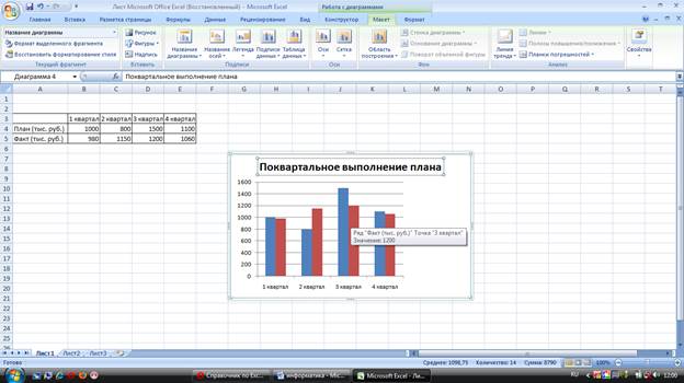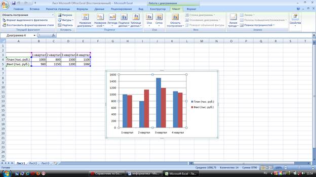10. Построенная диаграмма сохраняет связь с таблицей, по которой она строилась. Поэтому если вносить изменения в таблицу, то будет изменяться и сама диаграмма. В ячейке В3 измените число на 1100 и посмотрите, как изменился соответствующий столбик диаграммы. После построения диаграммы ее можно изменить по своему усмотрению. Если выделить всю диаграмму (щелчок по ее контуру), то можно внести глобальные изменения, например, установить для всей диаграммы один размер шрифта. Дважды щелкая на любом элементе диаграммы можно изменить его цвет, тип линии, параметры шрифта, и т.д. При измерении ряда диаграммы нужно следить, чтобы выделились все элементы ряда. Если диаграмма круговая или кольцевая, то выделять нужно отдельно каждый «кусочек». Для этого выполняют одинарный щелчок на любом «кусочке», затем второй одинарный щелчок, а только потом можно выполнить двойной щелчок, чтобы его изменить. Если выделить диаграмму и снова нажать на кнопку