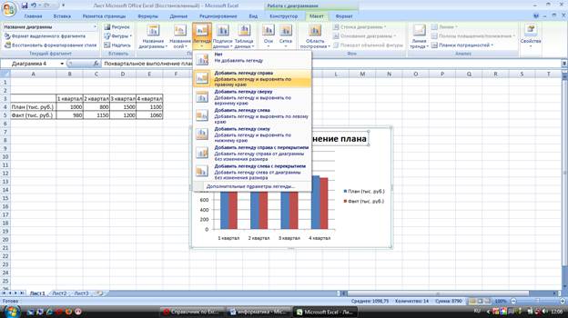 В поле названия диаграммы с клавиатуры введите название диаграммы. Для удаления названия диаграммы в меню кнопки Название диаграммы выберите вариант Нет. 5. В группе Подписи вкладки Работа с диаграммами/Макет щелкните по кнопке Легенда. Выберите вариант расположения легенды: