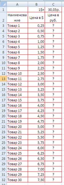Абсолютная адресация Иногда при растяжке ячеек с формулами необходимо, чтобы какой либо адрес не менялся, тогда его делают абсолютным. Для этого после ввода в формулу этого адреса сразу же нажимают на клавишу F4, тогда перед буквой столбца и числом строки вставляется значок $, который запрещает их изменять при растяжке. В нашем примерев ячейку С2 необходимо ввести формулу =В2*Е1 и сразу же нажать на F4, формула примет вид: =В2*$E$1, после чего ее можно растягивать вниз по столбцу. 3.. Постройте следующую таблицу. Обратите внимание, что надпись «1$=» и «30,50р.» написаны в разных ячейках.Наименования товара и цену в $можно растянуть. «Цена в руб.»= «Цена в $»* «Цена 1$»