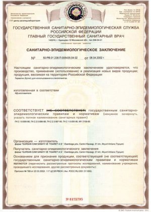 Санитарно-эпидемиологическое заключение — это документ, подтверждающий разрешение органами и учреждениями Департамента государственного санитарно-эпидемиологического надзора Минздрава РФ производства или ввоза продукции, соответствующей установленным требованиям, и служащим официальным подтверждением безопасности продукции для здоровья человека при соблюдении определенных условий. Образец санитарно-эпидемиологического заключения: