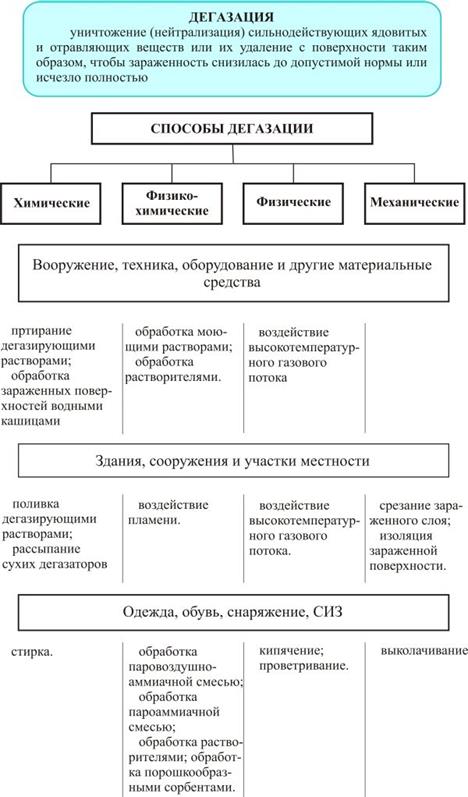 Объектами дезактивации могут быть жилые и производственные здания, участки, территории, оборудование, транспорт и техника, одежда, предметы домашнего обихода, продукты питания. Конечная цель дезактивации - обеспечить безопасность людей, исключить или уменьшить вредное воздействие ионизирующего излучения на организм человека. Дегазация - это уничтожение (нейтрализация) сильнодействующих ядовитых и отравляющих веществ или и удаление с поверхности таким образом, чтобы зараженность снизилась до допустимой нормы или исчезла полностью.