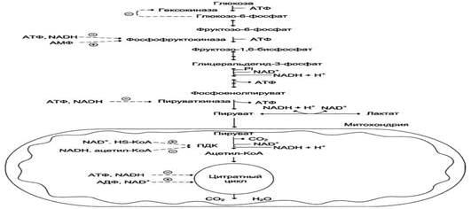Восстановление пирувата в лактат. Анаэробный гликолиз по сравнению с аэробным менее эффективен. В этом процессе катаболизм 1 моль глюкозы без участия митохондриальной дыхательной цепи сопровождается синтезом 2 моль АТФ и 2 моль лактата. АТФ образуется за счёт 2 реакций субстратного фосфорилирования. Поскольку глюкоза распадается на 2 фосфотриозы, то с учётом стехиометри-ческого коэффициента, равного 2, количество моль синтезированного АТФ равно 4. Учитывая 2 моль АТФ, использованных на первом этапе гликолиза, получаем конечный энергетический эффект процесса, равный 2 моль АТФ. Таким образом, 10 цитозольньгх ферментов, катализирующих превращение глюкозы в пируват, вместе с лактатдегидрогеназой обеспечивают в анаэробном гликолизе синтез 2 моль АТФ (на 1 моль глюкозы) без участия кислорода. Значение катаболизма глюкозы Основное физиологическое назначение катаболизма глюкозы заключается в использовании энергии, освобождающейся в этом процессе для синтеза АТФ. Энергия, выделяющаяся в процессе полного распада глюкозы до СО2 и Н2О, составляет 2880 кДж/моль. Если эту величину сравнить с энергией гидролиза высокоэнергетических связей - 38 моль АТФ (50 кДж на моль АТФ), то получим: 50×38 = 1900 кДж, что составляет 65% от всей энергии, выделяющейся при полном распаде глюкозы. Такова эффективность использования энергии распада глюкозы для синтеза АТФ. Необходимо учитывать, что реальная эффективность процесса может быть ниже. Точно оценить выход АТФ можно только при субстратном фосфорилировании, а соотношение между поступлением водорода в дыхательную цепь и синтезом АТФ является приблизительным. Аэробный распад глюкозы происходит во многих органах и тканях и служит основным, хотя и не единственным, источником энергии для жизнедеятельности. Некоторые ткани находятся в наибольшей зависимости от катаболизма глюкозы как источника энергии. Например, клетки мозга расходуют до 100 г глюкозы в сутки, окисляя её аэробным путём. Поэтому недостаточное снабжение мозга глюкозой или гипоксия проявляются симптомами, свидетельствующими о нарушении функций мозга (головокружения, судороги, потеря сознания). Анаэробный распад глюкозы происходит в мышцах, в первые минуты мышечной работы, в эритроцитах (в которых отсутствуют митохондрии), а также в разных органах в условиях ограниченного снабжении их кислородом, в том числе в клетках опухолей. Для метаболизма клеток опухолей характерно ускорение как аэробного, так и анаэробного гликолиза. Но преимущественный анаэробный гликолиз и увеличение синтеза лактата служит показателем повышенной скорости деления клеток при недостаточной обеспеченности их системой кровеносных сосудов. Кроме энергетической функции, процесс катаболизма глюкозы может выполнять и анаболические функции. Метаболиты гликолиза используются для синтеза новых соединений. Так, фруктозо-6-фосфат и глицеральдегид-3-фосфат участвуют в образовании рибозо-5-фосфата - структурного компонента нуклеотидов; 3-фосфоглицерат может включаться в синтез аминокислот, таких как серии, глицин, цистеин. В печени и жировой ткани ацетил-КоА, образующийся из пирувата, используется как субстрат при биосинтезе жирных кислот, холестерина, а дигидроксиацетонфосфат как субстрат для синтеза глицерол-3-фосфата. Регуляция катаболизма глюкозы Поскольку основное зн