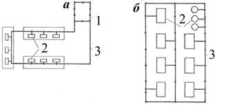 Рис. 7.7. Види захисних заземлень: а – виносне, б – контурне. 1 – заземлювач, 2 – електричне обладнання, 3 – сполучні дроти.