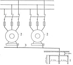 Рис. 7.8. Схема заземлення електроустановок: 1 – заземлювач, 2 – електричний двигун, 3 – заземлюючі провідники.