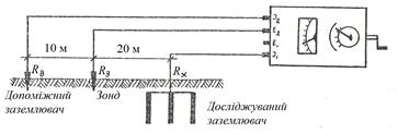 Заземлюючі провідники прокладаються відкрито по стінах будівель, оскільки вони завжди мають бути доступні до огляду. Якість кріплень захисного заземлення перевіряють регулярно, а вимір його опору виконують один раз на рік. У будь-яку пору року в установках до 1000 В опір захисного заземлення не має перевищувати 4 В. Вимір опору захисного заземлення можна виконати методом амперметра-вольтметра за допомогою мегомметра типу МС з використанням допоміжного заземлювача і потенціального електрода-зонда, які розташовані на достатній відстані від досліджуваного заземлювача (рис. 7.9).
