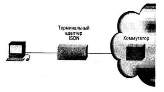 Рисунок 6 – Пример соединения «модем-модем» Адаптер терминала ISDN — это устройство, используемое для соединения базовых интерфейсов ISDN (ISDN Basic Rate Interface, BRI) с другими интерфейсами, такими как EIA/TIA-232, на маршрутизаторе. Адаптер терминала по сути является модемом ISDN, хотя и называется адаптером, так как на самом деле не преобразует сигналы из аналоговой формы в цифровую. Место адаптера терминала в среде ISDN показано на рис. 3.9.