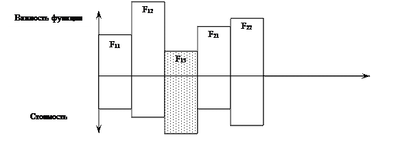 Известно, что каждый узел имеет свою стоимость, поэтому затраты на выполнение конкретной функции (подфункции) будут определяться как сумма стоимостей всех узлов, принимающих участие в данной функции. Сопоставление затрат на выполнение функций осуществляется на основе построения функционально-стоимостной диаграммы, где устанавливается значимость конкретной функции между собой и соответствующие затраты на их реализацию (рис.). Из ФСА видно явное несоответствие между важностью подфункции F13 и затратами на ее реализацию. В ходе ФСА изучаются следующие вопросы: - вносит ли использование закупаемого товара дополнительную ценность? - сопоставима ли стоимость товара с его значимостью? - необходимо ли в товаре присутствие всех свойств, которыми он обладает? v творческий, разрабатываются альтернативные варианты приведения в соответствие стоимости выполнения функции с ее значимостью; v исследовательский, происходит выбор наилучшего варианта устранения несоответствия; v рекомендательный, осуществляется тщательная проработка и документальное оформление принятого решения об устранении несоответствия; v внедренческий, осуществляется реализация принятого решения.