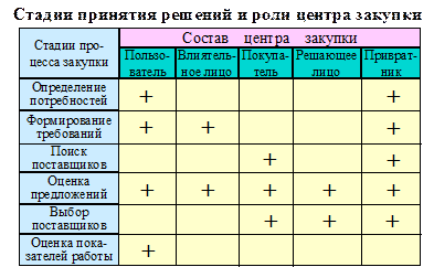 Этап 4. Поиск поставщиков. Происходит формирование перечня поставщиков с их характеристиками. Этап 5. Запрашивание предложений от поставщиков. Этап 6. Выбор поставщика. Происходит изучение предложений и производится ранжирование поставщиков, при этом используются следующие критерии: общая репутация поставщика, оперативность и надежность поставок, быстрота реакции на нужды клиента, качество товара, цена товара, полнота товарного ассортимента, возможность предоставления кредита и/или рассрочки, уровень квалификации агента-сбытовика, наличие гарантийного обслуживания, личные отношения и т.д. Этап 7. Заключение договора с поставщиком и выдача заказов на поставки. Указываются технические характеристики товара, количество, время поставки, условия оплаты и возврата, гарантии. Этап 8. Оценка работы поставщика. Рассмотрим роли участников закупочного центра в реализации процесса закупки (рис.).