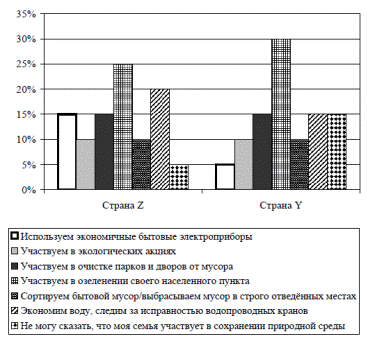 Учёные опросили жителей страны Z и страны Y. Им задавали вопрос: «Как Вы и Ваша семья участвуете в сохранении природной среды?» Найдите в приведённом списке выводы, которые можно сделать на основе диаграммы и запишите цифры, под которыми они указаны.