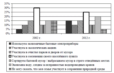 С начала 2000-х гг. правительство страны Z предприняло ряд мер по улучшению экологической ситуации. В 2002 и 2012 гг. социологической службой был проведён опрос совершеннолетних граждан. Им задавали вопрос: «Как Вы и Ваша семья участвуете в сохранении природной среды?»