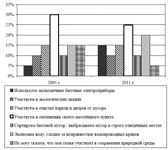 С начала 2000-х гг. правительство страны Z предприняло ряд мер по улучшению экологической ситуации. В 2005 и 2011 гг. социологической службой был проведён опрос совершеннолетних граждан. Им задавали вопрос: «Как Вы и Ваша семья участвуете в сохранении природной среды?» Найдите в приведённом списке выводы, которые можно сделать на основе диаграммы