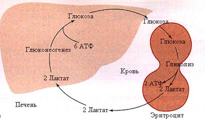 Рис. 5.11. Цикл Кори Чтобы непрерывно снабжать глюкозой клетки, для которых она является основным источником энергии, но они не могут окислить ее полностью в силу отсутствия митохондрий (эритроциты) или из-за работы в анаэробных условиях, между печенью и этими клетками устанавливаются циклические процессы по обмену субстратами. Один из таких – цикл Кори: образующаяся в мышцах (эритроцитах) молочная кислота поступает в общий кровоток, захватывается печенью и используется ею в качестве субстрата глюконеогенеза; синтезируемая при этом глюкоза отдается в кровототок и метаболизируется мышцами или эритроцитами для получения энергии (рис. 5.11).