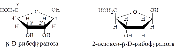 Нумерация атомов производится в указанном порядке. Отметим также, что в физиологических условиях нуклеиновые основания существуют только в лактамной и аминной формах. Во всех формах гетероциклы сохраняют ароматичность и имеют плоское строение, благодаря чему отличаются высокой термодинамической стабиль-ностью. Углеводным компонентом нуклеиновых кислот являются пентозы: D-рибоза или 2-дезокси-D-рибоза. Обе пентозы всегда находятся в фуранозной форме и имеют b-конфигурацию аномерного атома С-1¢ (в формулах нуклеотидов и нуклеозидов атомы углерода моносахаридов нумеруются цифрой со штрихом):