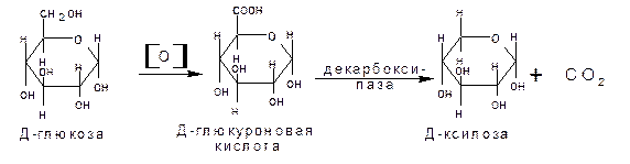 Уроновые кислоты играют большую роль в качестве промежуточных продуктов при образовании пентоз из гексоз. Так, например, образующаяся при окислении глюкозы глюкуроновая кислота, подвергаясь декарбоксилированию, может дать ксилозу: