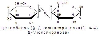 По строению целлобиоза состоит из 2х молекул b-Д глюкозы, но в отличие от мальтозы, связанных b-(1→4)-гликозидной связью: