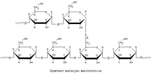 Такая форма обусловлена тем, что остатки a-Д-глюкозы в составе амилозы имеют конформацию лодки, которая способствует спирализации полигликозидной цепи.. На каждый виток спирали приходится 6 остатков глюкопиранозы. Во внутренний канал спирали могут входить соответствующие по размеру молекулы, например, молекулы йода образуют комплексы, называемые соединениями включения, комплекс амилозы с йодом имеет синий цвет. Это используется в аналитических целях для открытия как крахмала, так и йода. Амилопектин в отличие от амилозы имеет сильно разветвленную структуру. В его молекулу входит до 50.000 a-D-глюкопиранозных остатков. Наряду с a(1®4) связями в амилопектине имеются также a-(1®6) гликозидные связи, представляющие собой точки ветвления. Между точками ветвления располагается 20-25 глюкопиранозных остатков. Гликозидные a–(1®6) связи составляют около 5% от общего количества связей, содержащихся в молекуле амилопектина. Методом рентгеноструктурного анализа показано, что структура амилопектина напоминает гроздь винограда.
