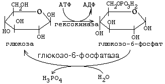 Биологический смысл гексокиназной реакции: 1. Сделать молекулу глюкозы более способной к химическим реакциям, ослабить в ней химические связи, дестабилизировать её ("расшатать"). 2. Связать, задержать глюкозу в клетке, чтобы она не смогла выйти обратно в кровь (глюкозо-6-фосфат не способен проходить через клеточную мембрану). Чтобы связанная молекула могла выйти из клетки, глюкозо-6-фосфат должен превратиться обратно в глюкозу. Фермент, катализирующий обратную реакцию (превращение глюкозо-6-фосфата обратно в глюкозу), называется глюкозо-6-фосфатаза. Он гидролизует глюкозо-6-фосфат до глюкозы и Н3РО4 (Фн), то есть катализирует обходной обратный путь гексокиназной реакции. Глюкозо-6-фосфатаза есть в печени, почках и слизистой оболочке кишечника. 3. Гексокиназа - это ключевой фермент всего метаболизма глюкозы. Он лимитирует (ограничивает) скорость всех путей метаболизма глюкозы в клетке. Гексокиназа всегда работает с максимальной скоростью. Только в печени есть ещё один фермент, катализирующий реакцию превращения глюкозы в глюкозо-6-фосфат. Это изофермент гексокиназы - глюкокиназа. "На высоте пищеварения", когда концентрация глюкозы в воротной вене во много раз возрастает, глюкокиназа работает очень интенсивно. Следовательно, утилизация глюкозы клетками печени "на высоте пищеварения" возрастает при подключении дополнительного пути метаболизма (работа глюкокиназы). Регуляторная роль гексокиназы: этот фермент угнетается избытком своего продукта - глюкозо-6-фосфата. Если по какой-то причине дальнейшее использование глюкозо-6-фосфата замедляется (его концентрация при этом возрастает), то автоматически тормозится гексокиназная реакция. Поэтому в такой ситуации замедляется использование в клетке глюкозы в целом. После образования глюкозо-6-фосфата начинается разветвление дальнейших путей метаболизма глюкозы. Таких главных путей три. 1. Гексозомонофосфатный путь распада углеводов (ГМФ-путь) 2. Гексозобисфосфатный путь распада углеводов (ГБФ-путь). 3. Синтез гликогена. Есть ещё минорные пути (в них используется небольшая доля глюкозы, поступающей в клетку). Эти пути не играют энергетической роли, а используются для построения олиго- и полисахаридных цепей гликопротеинов, то есть выполняют структурную роль.