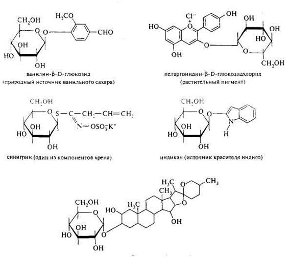 Производные моносахаридов. Исключительно важной реакцией моносахаридов является образование гликозидов при взаимодействии активного полуацетального или полукетального гидроксила с гидроксильной группой другого соединения. Так, D-глюкоза дает с метанолом α- и β-метил-D-глюкопиранозиды. Гликозиды метилированных сахаров, благодаря летучести в высоком вакууме, используются для газожидкостной хроматографии и масс-спектрометрии. Неуглеводная часть молекулы, т. е. группа, замещающая протон гидроксильной группы, называется агликоном. Соединения, имеющие одну или несколько гликозидных связей, имеют большое значение в биохимии. Это основная связь, с помощью которой образуются олиго- и полисахариды. Таким образом, гликозидная связь в химии углеводов имеет такое же значение, какое в белковой химии имеет пептидная связь, а в химии нуклеиновых кислот — фосфодиэфирная. В природе встречается большое разнообразие гликозидов. Многие из них применяют в пищевой промышленности и медицине: