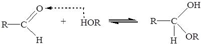 Циклические формы моносахаридов На основе ряда химических свойств моносахаридов было сделано предположение о том, что полисахариды существуют в основном не в принятой линейной форме, а в циклической, причем такой в которой отсутствует карбонильная группа. Как же происходит образование циклической формы моносахаридов? Вспомним, что одна из типичных реакций альдегидов – взаимодействие со спиртами с образованием полуацеталей, а возникающей в результате присоединения (полуацетали) гидроксил в полуацетате отличается повышенной реакционной способностью: