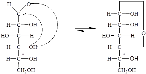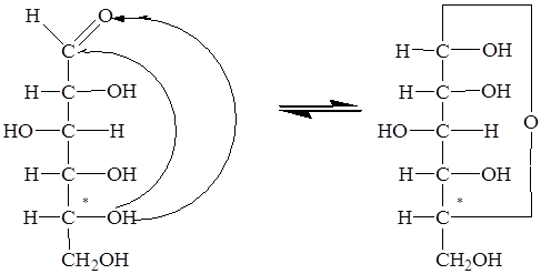 В линейных формулах моносахаридов имеются одновременно как карбонильные, так и несколько гидроксильных групп. В результате внутримолекулярного взаимодействия между этими группами (по антологии с выше изложенным), образуются полуацетали, имеющие циклическое строение. Например, для альдогексозы взаимодействие легче всего должно происходить за счет гидроксилов при четвертом и пятом атомах углерода, т.к. в этих случаях будут образовываться наиболее устойчивые пяти и шести членные циклы.