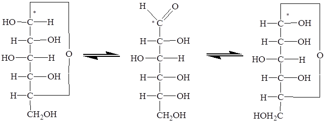 b- и a - не являются оптическими антиподами, так как имеют противоположное расположение групп лишь при одном асимметричном атоме. Атом углерода (С *) у которого наблюдается этот вид изомерии называют аномерным центром, а a - и b- формы аномерами. Полуацетальный гидроксил (при С *) называют гликозидным гидроксилом.
