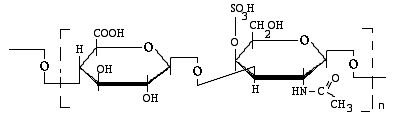 Рисунок ХХ. Мономер хондроитин-4-сульфата, построенный из глюкуроновой кислоты и N-ацетилгалактозаминсульфата, соединенных β(1,3)-гликозидной связью.