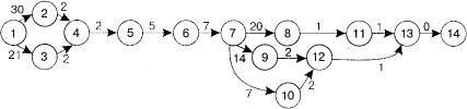 Т — максимальный путь в днях, проходящий через данную работу, от исходного до завершающего события; tk — продолжительность части критических работ в днях, расположенных на рассматриваемом пути; Тk — продолжительность критического пути в днях. Как мы уже говорили в Разделе 4, чем выше значение коэффициента напряженности, тем более жесткими являются временные оценки отдельных работ, а резервы времени на рассматриваемом пути в меньшей степени можно использовать для оптимизации сетевого графика. В данном примере можно определить, что для работ: Кн = (6-7-9-12-13-14) = (24 – 7) / (117 – 7) = 0,15, Кн = (6-7-10-12-13-14) = (17 – 7) / (117 – 7) = 0,09. Сравнивая эти значения коэффициентов между собой, можно сделать вывод, что путь Т для работ 6-7-9-12-13-14 напряженнее, чем путь для работ 6-7-10-12-13-14. В случае если длина критического пути окажется меньше директивной продолжительности и сокращение времени работ экономически нецелесообразно, то можно привести график в соответствие с установленным сроком путем уменьшения ресурсов на ряде работ критического пути и прилегающей к нему околокритической зоны. Однако помните, что при анализе и оптимизации сетевых графиков по времени следует учитывать то, что концентрация ресурсов на любых работах имеет определенные технологические ограничения — по фронту работ, технологии, технике безопасности и другим факторам. Кроме того, не следует допускать, чтобы в результате перераспределения ресурсов полностью исчерпались резервы времени, так как в этом случае возникает большое количество критических путей, график становится напряженным и трудновыполнимым.