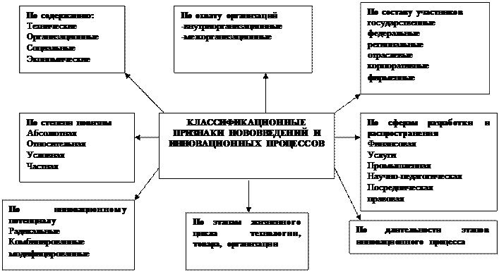 Существуют различные виды классификации инноваций. В зависимости от используемых критериев различают: по видам работ – научные, технические (конструкторские и технологические), опытно‑экспериментальные и производственные инновации; по конкретным результатам процесса нововведений (инноваций) – патенты, изобретения, новые или модифицированные изделия, прогрессивные технологические процессы, услуги, стандарты, новые методы управления и организации производства; по степени новизны – принципиально новые, новые, модификационные (модифицирующие) и псевдоинновации (псевдонововведения); по предметному (вещественному) содержанию – продуктовые, технологические, социально‑экономические, экологические, информационные, организационные и управленческие инновации; по виду эффекта – научно ‑ технические, экономические, социальные, экологические, информационные и политические инновации; по охвату основных сфер деятельности – производственно ‑ технологические, организационно ‑ управленческие, социально ‑ политические и финансово ‑ экономические инновации. В практике управления инновационным процессом учитываются, прежде всего, наиболее важные критерии, отражающие существо инноваций (нововведений) и вытекающие непосредственно из определения понятия «инновация». К таким критериям относятся степень новизны и предметное содержание. Среди инноваций, выделяемых по предметному содержанию, наиболее важными являются продуктовые и технологические, но определяющими – продуктовые. Продуктовые новшества (инновации) являются определяющими как способы и средства удовлетворения общественных потребностей, прежде всего материальных. Значительную часть продуктовых новшеств (инноваций) составляют средства труда. Продуктовые новшества стали определяющими по отношению к другим и по той причине, что многие организационно‑управленческие, социально‑экономические нововведения обусловлены появлением новых видов продукции и условиями их потребления. Более того, само практическое осуществление таких инноваций в основном зависит от уровня продуктовых нововведений (инноваций) и темпов их распространения. Например, внедрение АСУ (организационно‑управленческое новшество) или очистка водоемов (экологическое новшество) определяется уровнем развития технических средств – вычислительной техники, очистных сооружений и т. д. (продуктовых новшеств). Об этом свидетельствует показатель масштабности работ по продуктовым нововведениям (около 70 %). Продуктовые новшества в зависимости от области их применения подразделяются на продукцию производственного, потребительского и иного назначения (научное, оборонное, спортивное, экологическое). Все эти новшества (инновации) независимо от их назначения представляют собой промышленную продукцию. Инновация характеризуется такими родственными терминами, как инновационный процесс, инновационная деятельность, инновационный потенциал и потенциал инновации. Инновационный процесс рассматривается как процесс прохождения новшеством цикла «исследование – производство – потребление». Инновационная деятельность – это различные виды работ по созданию новшеств, в состав которых входят исследования поисково‑прикладного характера, проектно‑конструкторские и технологические разработки, о