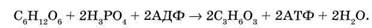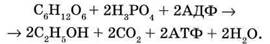 Таким образом, при гликолизе из одной молекулы глюкозы образуются две молекулы трехуглеродной пировиноградной кислоты (С3Н4О3), которая во многих клетках, например в мышечных, превращается в молочную кислоту (С3Н6О3), причем высвободившейся при этом энергии достаточно для превращения двух молекул АДФ в две молекулы АТФ. Несмотря на кажущуюся простоту, гликолиз — процесс многоступенчатый, насчитывающий более десяти стадий, катализируемых разными ферментами. Только 40% выделившейся энергии запасается клеткой в виде АТФ, а остальные 60% — рассеиваются в виде тепла. Благодаря многостадийности гликолиза выделяющиеся небольшие порции тепла не успевают нагреть клетку до опасного уровня. Гликолиз происходит в цитоплазме клеток. У большинства растительных клеток и некоторых грибов второй этап энергетического обмена представлен спиртовым брожением: