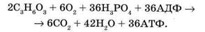 Исходные продукты спиртового брожения те же, что и у гликолиза, но в результате образуется этиловый спирт, углекислый газ, вода и две молекулы АТФ. Есть такие микроорганизмы, которые разлагают глюкозу до ацетона, уксусной кислоты и других веществ, но в любом случае «энергетическая прибыль» клетки составляет две молекулы АТФ. Третий этап энергетического обмена — полное кислородное расщепление, или клеточное дыхание. При этом вещества, образовавшиеся на втором этапе, разрушаются до конечных продуктов — СО2 и Н2О. Этот этап можно представить себе в следующем виде: