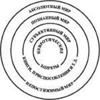 Глава 4 РЕАЛЬНОСТЬ Ни один организм не самодостаточен. Он нуждается в окружающем мире для удовлетворения своих потребностей. Рассматривать организм сам по себе равносильно тому, чтобы представлять его как искусственно изолированное целое, в то время как всегда существует взаимозависимость между организмом и его окружением. Организм является частью мира, но он также может переживать окружающий мир как нечто отдельное от себя — как нечто столь же реальное, как и он сам. На протяжении долгих веков едва ли многие проблемы занимали умы философов более, чем проблема реальности. Сформировались две основные философские школы: одна утверждает, что мир существует только в наших ощущениях, другая придерживается мнения, что реальность существует независимо от восприятия. Все помнят историю о некоем человеке, пнувшем философа в ногу и пытавшемся затем убедить последнего в том, что боль существует лишь в его, философа, восприятии. Но данная проблема не так проста. Ее решение проще и сложнее одновременно. В этой книге я не намерен затрагивать философские вопросы в большей степени, нежели это окажется абсолютно необходимым для разрешения наших проблем, и мне меньше всего хотелось бы вступать с кем-либо в словесную перепалку. Я хочу подчеркнуть лишь то, что если бы у того человека не возникло желания пинать фило- Реальность софа, тот так и остался бы в неведении относительно существования своей голени. Мы можем сделать даже еще один шаг и задаться таким вопросом: учитывая тот факт, что инструменты, раздвигающие границы нашего восприятия, служат нашим же интересам, существует ли мир perse или же лишь пока на него направлен наш интерес. Для наших целей мы допускаем предположение о том, что существует объективный мир, который служит основой для создания индивидом своего собственного, субъективного мира. Мы отбираем части безграничной вселенной в соответствии с нашими интересами, но этот отбор, в свою очередь, ограничен средствами восприятия, а также социальным и невротическими ограничениями. Далее мы познакомимся с другим, псевдомиром, играющим огромную роль в нашей жизни и в цивилизации в целом, обретшим собственную реальность — миром проекций. Вся проблема существования мира свелась к вопросу: сколько процентов мира существует для индивида? Внешний круг может представлять мир per se. Следующий за ним круг указывает на опосредованное знание о мире, знание, которое мы добываем с помощью инструментов интеллекта (книги, обучение) или приспособлений, утончающих наше восприятие (например, телескоп и микроскоп). Лучший способ убедиться в существовании этой части мира — провести жутковатый эксперимент со свистком Гальтона, издающим звуковые колебания с частотой выше воспринимаемого человеческим ухом предела. Если