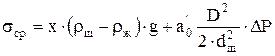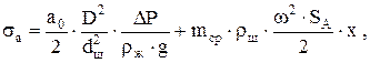 где а0 - опытный коэффициент, имеющий размерность удельного веса и учитывающий плотность жидкости, силы трения и другие факторы, не поддающиеся аналитическому расчету. Его принимают равным 11500 Н/м3; х - расстояние от рассчитываемого сечения штанг до плунжера; D - диаметр плунжера; dш - диаметр штанг; ΔР - перепад давления над плунжером; ρж - плотность жидкости; ω = π·n / 30 - угловая скорость вращения кривошипа; mср - средний кинематический показатель совершенства СК,