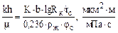 где k - коэффициент проницаемости, мкм2; h - эффективная мощность пласта, м; b - объемный коэффициент нефти; Rк- условный радиус контура питания, м; rс- радиус скважины, м; φc- коэффициент гидродинамического несовершенства скважины.
