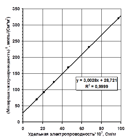С целью определения Кк и l¥ построим график в координатах 1/ l¥ = 28,721 Þ l¥ = 3,48×10-2 См×м2/моль. Константу кислотности вычислим по формуле (2.20):