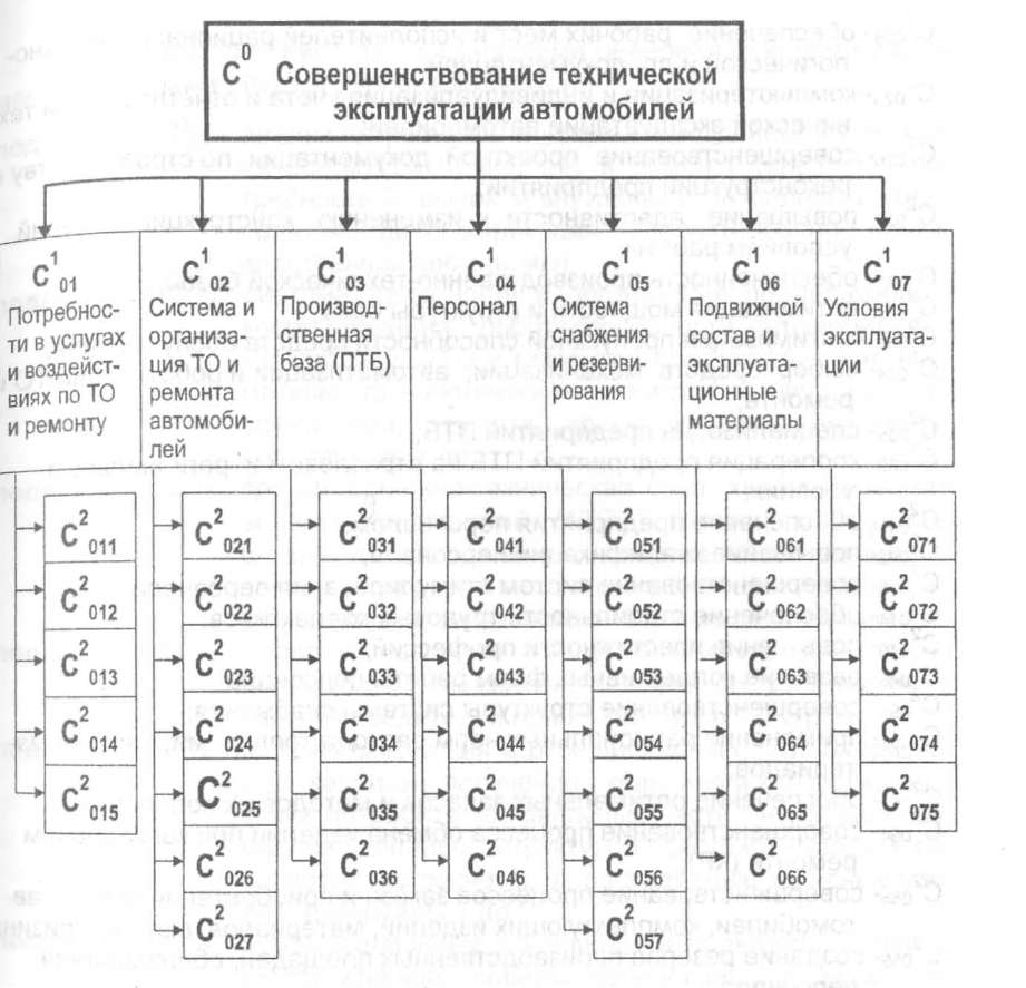 С2оп - маркетинговый анализ рынка услуг (спрос, содержание, конкурен- 2 Ция); - внутренняя потребность предприятия; С 013- оценка возможностей собственного производства (объем услуг, 2 цены, предложения); диверсификация и расширение сфер деятельности предприятия; С 015- корректирование производственной программы предприятия с 2 учетом внутренних и внешних потребностей; Ч°21- применение обоснованных нормативов системы; ^2022- обеспечение выполнения рекомендаций и нормативов системы; ^ 023- совершенствование технологии, организации и управления процессами ТО и Р; С2о24- обеспечение рабочих мест и исполнителей рациональной технологической и др. документацией; С"о25- компьютеризация и индивидуализация учета и отчетности при технической эксплуатации автомобилей; С2о26- совершенствование проектной документации по строительству и реконструкции предприятий; С2о27- повышение адаптивности к изменению конструкций изделий, условиям работы; С2оз1- обеспеченность производственно-технической базой; С2оз2- оптимизация мощности и структуры базы; С2озз - оптимизация пропускной способности средств обслуживания; С2оз4- выбор средств механизации, автоматизации и роботизации ТО и ремонта; С2оз5- специализация предприятий ПТБ; С2озб- кооперация предприятий ПТБ на отраслевом и региональном уровнях; С2о41- обеспечение предприятия персоналом; С2о42- повышение квалификации персонала; С204з- совершенствование систем стимулирования персонала; С2о44- обеспечение стабильности трудовых коллективов; С2о45- повышение престижности профессий; С2о46- развитие коллективных форм работы персонала; С2о51- совершенствование структуры системы снабжения; С2о52- применение рациональных норм расхода топлив, масел и др, материалов; С2о5з- обеспечение оптимальных запасов и методов их пополнения; С2о54- совершенствование процесса обмена изделий при капитальном I ремонте (КР); С2о55- совершенствование процессов заказа и приобретения новых автомобилей, комплектующих изделий, материалов, включая лизинг; С2о56- создание резерва производственных площадей, оборудования, персонала; С2о57- создание резерва исправных автомобилей; С2об1- выбор рациональных типов и моделей автомобилей; С2об2- выбор эксплуатационных материалов; С2обз- повышение качества восстановления и КР изделий; С2об4- изменение структуры парка (тип, грузоподъемность, вместимость, I применяемое топливо и др.); С2об5- управление возрастной структурой парка, рациональные сроки i службы; С2обб- повышение уровня унификации изделий и материалов; С2о71- учет природно-климатических условий; С2о72- учет дорожных условий; С2о7з- учет транспортных условий и интенсивности использования изде- | лий; С2о74- выбор автомобилей, комплектующих изделий, материалов с учетом условий эксплуатации; С2о75- использование автомобилей с учетом возраста, состояния и усло-1 вий эксплуатации. Как следует из рис. 19, важнейшими целереализующими системами (факторами) первого уровня являются: одсистема C[2]oi - анализ потребности в услугах и воздействиях по техническому обслуживанию и ремонту (внешние потребности - рынок и внутренние потребности предприятия, диверсификация, корректирование производственной программы); подсистема С1ог- система, технология и организация поддержания и восстановления работоспособности автомобилей и парков: виды ТО и ремонта, соответствующие норма