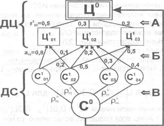 Последняя строка матрицы содержит «веса» подцелей при формировании генеральной цели Ц°, а именно: 3) Для каждой подсистемы определяется ее структурный вклад в достижение генеральной цели системы, т.е. Ц°. Для этого используют данные функционально-системной матрицы, а в более сложных структурах ДЦ и ДС составляют цепочки влияния. При этом структурный вклад подсистемы в достижение генеральной це- I |0 ли Ц определяется перемножением ее вклада в достижение подцели