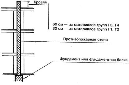 4.1.3. Противопожарные стены и перегородки могут использоваться для разделения помещений с различной функциональной пожарной опасностью или с различной пожарной нагрузкой. 4.1.4. Предел огнестойкости противопожарных стен и перегородок должен соответствовать требованиям СНиП 21-01. При проектировании может быть выполнено обоснование увеличения или уменьшения предела огнестойкости противопожарной стены или перегородки, учитывающее величину пожарной нагрузки в помещениях, разделяемых этой стеной или перегородкой, ее фактический предел огнестойкости при температурном режиме реального пожара и возможность обеспечения тушения пожара за время достижения предела огнестойкости противопожарной стены. Обоснование уменьшения предела огнестойкости противопожарной стены должно быть согласовано в установленном порядке. 4.1.5. Противопожарные стены должны опираться на фундаменты или фундаментные балки и, как правило, пересекать все конструкции и этажи (рис. 5). Противопожарные стены допускается устанавливать непосредственно на конструкции каркаса здания или сооружения, выполненные из материалов группы НГ и отвечающие требованиям пп. 5.13 и 7.9 СНиП 21-01. 4.1.6. Противопожарные стены должны возвышаться над кровлей: не менее чем на 60 см, если хотя бы один из элементов чердачного или бесчердачного покрытия, за исключением кровли, выполнен из материалов групп ГЗ, Г4; не менее чем на 30 см, если элементы чердачного или бесчердачного покрытия, за исключением кровли, выполнены из материалов групп Г1, Г2 (рис.5). Противопожарные стены могут не возвышаться над кровлей, если все элементы чердачного или бесчердачного покрытия, за исключением кровли, выполнены из материалов группы НГ. 4.1.7. Противопожарные стены в зданиях с наружными стенами классов пожарной опасности К1, К2 и КЗ должны пересекать эти стены и выступать за наружную плоскость стены не менее чем на 30 см (рис. 4).