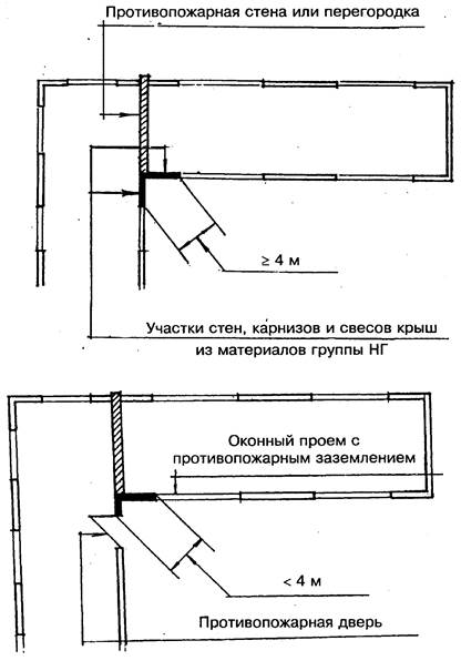При устройстве наружных стен из материалов группы НГ с ленточным остеклением противопожарные стены должны разделять остекление. При этом допускается, чтобы противопожарная стена не выступала за наружную плоскость стены. 4.1.8. При разделении здания на пожарные отсеки противопожарной должна быть стена более высокого и более широкого отсека. Допускается в наружной части противопожарной стены размещать окна, двери и ворота с ненормируемыми пределами огнестойкости на расстоянии над кровлей примыкающего отсека не менее 8 м по вертикали и не менее 4 м от стен по горизонтали. 4.1.9. При размещении противопожарных стен или противопожарных перегородок в местах примыкания одной части здания к другой под углом необходимо, чтобы расстояние по горизонтали между ближайшими гранями проемов, расположенных в наружных стенах, было не менее 4 м, а участки стен, карнизов и свесов крыш, примыкающие к противопожарной стене или перегородке под углом, на длине не менее 4 м были выполнены из материалов группы НГ. При расстоянии между указанными проемами менее 4 м они должны заполняться противопожарными дверями или окнами 1-го типа (рис. 6). 4.1.10. В зданиях III степени огнестойкости при выделении помещений противопожарными перегородками 1-го типа и перекрытиями 3-го типа несущие конструкции здания, на которые они опираются, должны иметь огнезащиту, обеспечивающую предел огнестойкости несущих конструкций не менее пределов огнестойкости этих перегородок и перекрытий. В случаях, когда величина пожарной нагрузки в помещениях меньше рассчитанной допустимой величины пожарной нагрузки для этих конструкций с учетом воздействия реального пожара, допускается огнестойкость несущих конструкций принимать исходя из фактической величины пожарной нагрузки по согласованию в установленном порядке. 4.1.11. В зданиях всех степеней огнестойкости для выделения рабочих мест в пределах помещения допускается применять перегородки остекленные или с сеткой при высоте глухой части не более 1,2м (сборно-разборные и раздвижные) с ненормируемыми пределами огнестойкости и из материалов группы НГ (рис. 7).