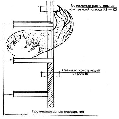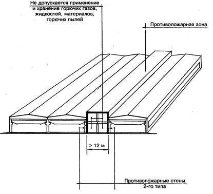 4.2. Перекрытия 4.2.1.Противопожарные перекрытия должны примыкать к наружным стенам, выполненным из материалов группы НГ, без зазоров. Противопожарные перекрытия в зданиях с наружными стенами классов К1, К2 и КЗ или с остеклением, расположенным в уровне перекрытия, должны пересекать эти стены и остекление (рис. 8). В местах пересечения целесообразно устраивать гребни, выступы или козырьки, предотвращающие переход пламени или продуктов горения через оконные проемы. 4.3. Зоны 4.3.1. Допускается в случаях, предусмотренных в разделах настоящего Пособия, для разделения зданий на пожарные отсеки вместо противопожарных стен 1 -го типа предусматривать противопожарные зоны. Противопожарная зона выполняется в виде вставки, разделяющей здание по всей ширине (длине) и высоте. Вставка представляет собой часть здания, образованную противопожарными стенами 2-го типа, которые отделяют вставку от пожарных отсеков. Ширина зоны должна быть не менее 12м. В помещениях, расположенных в пределах противопожарной зоны, не допускается применять или хранить горючие газы, жидкости и материалы, а также предусматривать процессы, связанные с образованием горючих пылей (рис. 9). Допускается в покрытии противопожарной зоны применять утеплитель из материалов групп Г1, Г2 и кровлю из материалов групп ГЗ, Г4 с учетом требований п. 4.1.6. В противопожарных стенах зоны допускается устройство проемов при условии их заполнения в соответствии с табл. 2 СНиП 21 -01. 4.3.2. Конструктивные решения противопожарных зон в сооружениях следует принимать по СНиП 2.09.03. 4.4. Пересечения инженерными коммуникациями, шахты, каналы 4.4.1. При прокладке кабелей и трубопроводов через ограждающие конструкции с нормируемыми пределами огнестойкости и классами пожарной опасности зазоры между ними следует заполнять материалами, не снижающими предел огнестойкости и класс пожарной опасности этих конструкций (рис. 10).