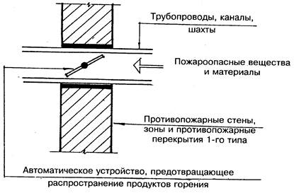 4.4.2. В противопожарных стенах допускается устраивать вентиляционные и дымовые каналы так, чтобы в местах их размещения предел огнестойкости противопожарной стены с каждой стороны канала был не менее REI 150 в противопожарных стенах 1 -го типа и REI 45 в противопожарных стенах 2-го типа (рис. 11). 4.4.3. При проектировании пересечений противопожарных преград воздуховодами следует руководствоваться указаниями СНиП 2.04.05. 4.4.4. При транспортировании пожароопасных веществ и материалов транспортирующие конструкции должны выполняться из материалов группы НГ. В этих случаях или при использовании материалов групп Г1—Г4 в этих конструкциях следует предусматривать устройство отсеков, секций, ограничение разлива горючих жидкостей, защиту отверстий клапанами, огнепреградителями, устройство зон, поясов и вставок из материалов группы НГ, применение автоматических средств пожаротушения. При невозможности пересечения в процессе эксплуатации коммуникаций преградами следует устраивать перекрывающиеся во время пожара заслоны или вставки из материалов, вспучивающихся при высоких температурах и преграждающих распространение пожара (рис. 12).