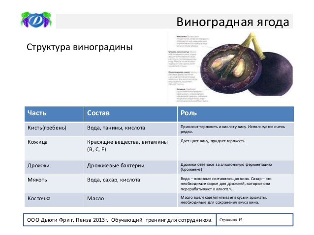 В России по содержанию сахара: -сухие – не более 4 гр/л.,алк.-8,5-15%; -п/сухие- 4-18 гр/л.,алк.-8,5-15%; -п/сладкие-18-45 гр/л.,алк-8,5-15%; -сладкие от 45гр/л., алк.8,5-15%; По срокам реализации: Молодые вина- вина, которые нужно реализовать до 1 января следующего за годом урожая. (Например, Божоле Нуво). Вина без выдержки- эти вина нужно реализовать до 1 января, следующего после года сбора урожая. Высококачественные - их производят из определенных высококачественных сортов винограда из определенных регионов. Производится тщательный контроль и отбор сырья. Они проходят обязательную выдержку в крупных металлических цистернах или дубовых бочках. В результате повышаются их органолептические свойства. В мире существует более 10.000 сортов культурного винограда Все сорта делят на: Столовые - предназначены для еды, (например, Кишмиш). Универсальные - могут использоваться как для еды, так и для производства вина. (Например, Мускат). Технические - предназначены для производства вина.(Например, Пино Нуар, Рислинг). Практически все технические сорта винограда относятся к одному виду — Vitis Vinifera. Из чего состоит виноградная ягода? Мякоть. Она содержит много воды и сахара, а также аминокислот. У большинства сортов винограда она имеет сероватый оттенок, и сок получается бесцветный. Косточки. Их количество и размер также могут различаться в зависимости от тех или иных сортов. Они содержат танины (вяжущие вещества) и эфирные масла. Кожица. Особенно, важна, для красных вин, так как именно в ней скапливаются красящие вещества (антоцианы), придающие вину цвет. В ней также содержатся танины, и соединения, отвечающие за ароматику и потенциал вина к выдержке. Все сорта будут отличаться особенностями строения винограда, методом их возделывания и органолептическими свойствами.