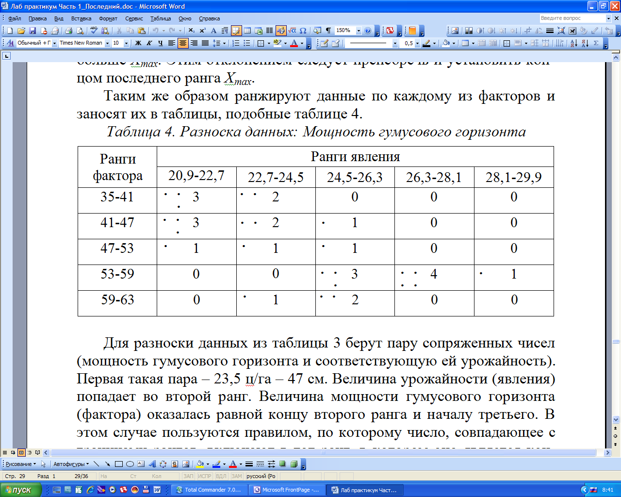 Для разноски данных из таблицы 3 берут пару сопряженных чисел (мощность гумусового горизонта и соответствующую ей урожайность). Первая такая пара – 23,5 ц/га – 47 см. Величина урожайности (явления) попадает во второй ранг. Величина мощности гумусового горизонта (фактора) оказалась равной концу второго ранга и началу третьего. В этом случае пользуются правилом, по которому число, совпадающее с границами рангов, включают в тот ранг, в котором оно является концом. Поэтому число 47 следует включить во второй ранг фактора. Таким образом, первая пара данных дает точку связи на пересечении второй строки и второго столбца. Для того, чтобы зафиксировать в таблице этот факт в данной ячейке ставят точку. Подобным образом выполняют разноску всех данных по первому фактору. Для подсчета попадающих в ячейки точек связи пользуются следующими обозначениями: