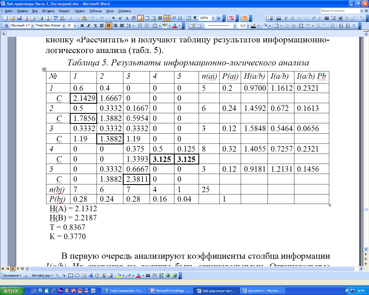 Запустив программу, устанавливают размер матрицы и вводят в нее данные из таблицы разноски. Затем нажимают с помощью мыши кнопку «Рассчитать» и получают таблицу результатов информационно-логического анализа (табл. 5).