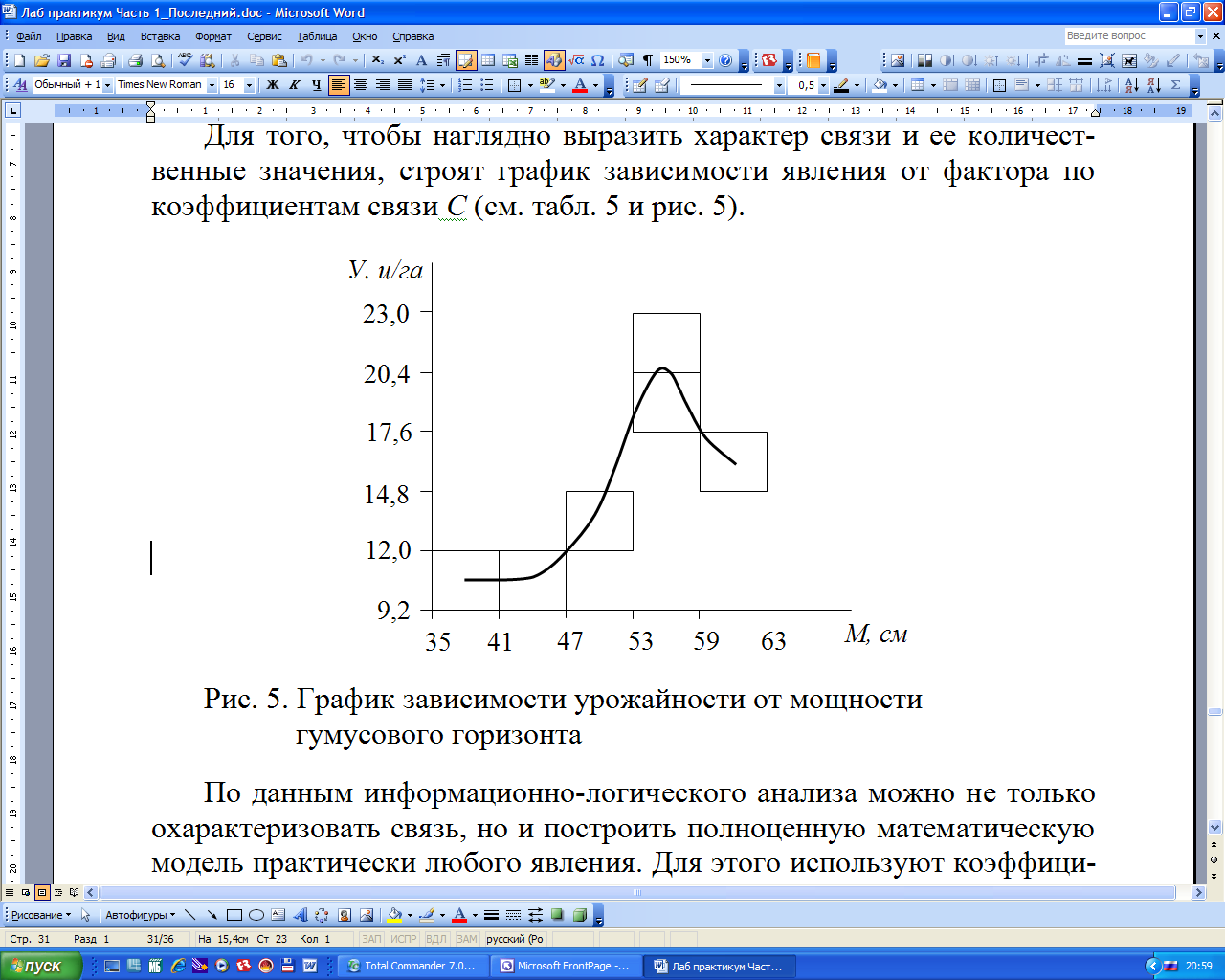 Информационно-логический анализ позволяет установить значения фактора, в которых явление наиболее устойчиво, то есть принимает состояние, вероятность наступления которого наибольшая. Для этого используют коэффициенты связи С. Чем больше величина коэффициента связи между фактором и явлением, тем, следовательно, устойчивее явление. Наибольшее значение С при анализе таблицы 5 обнаруживаем в четвертом ранге фактора и четвертом и пятом рангах явления. Следовательно, наиболее вероятный размер урожайности – 26,3-29,9 ц/га при мощности гумусового горизонта 47-53 см.