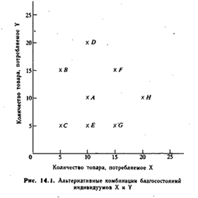 На рисунке 14.1 представлены точки, выражающие альтернативные комбинации благосостоянии индивидуумов X и Y. Благосостояние каждого индивидуума условно измеряется в количестве потребляемых им товаров.
