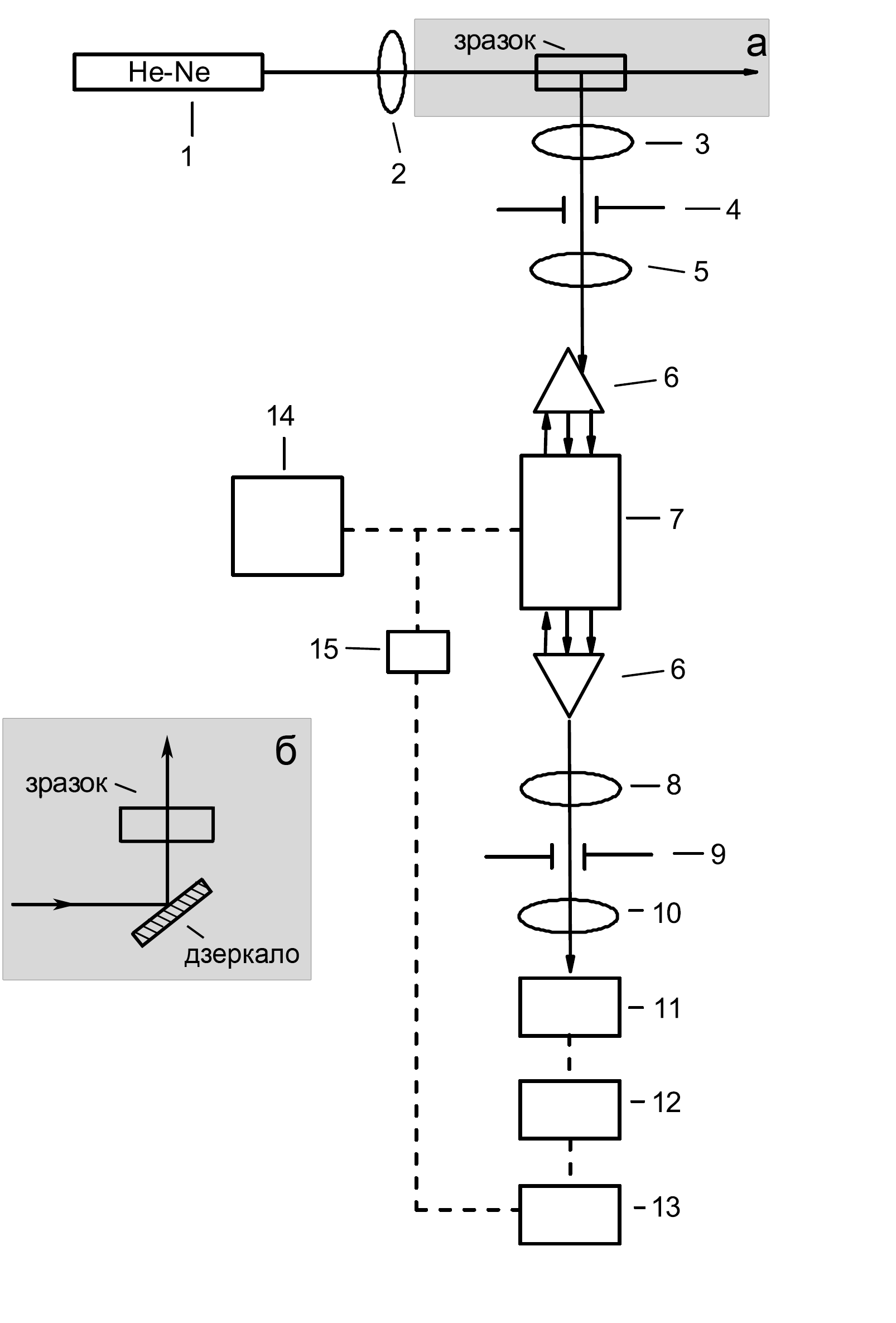 Рис. 3.1 Блок-схема експериментальної установки для дослідження мандельштам – бріллюенівського та релеївського розсіювання. а – 90˚ геометрія розсіювання; б – геометрія розсіювання назад (180˚). що відповідає області дисперсії