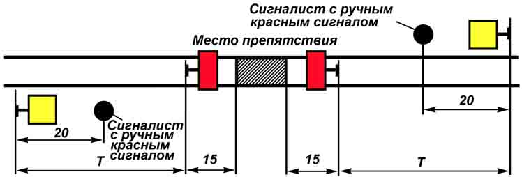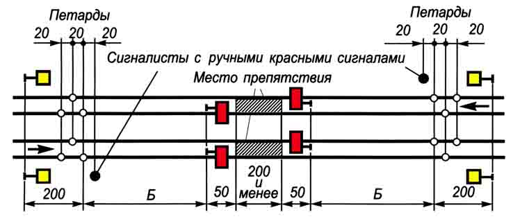 На железнодорожных путях общего пользования переносные сигналы уменьшения скорости и петарды должны находиться под охраной сигналистов, стоящих с ручными красными сигналами в 20 м от первой петарды, а на железнодорожных путях необщего пользования – от сигналов уменьшения скорости в сторону места работ (места препятствия).