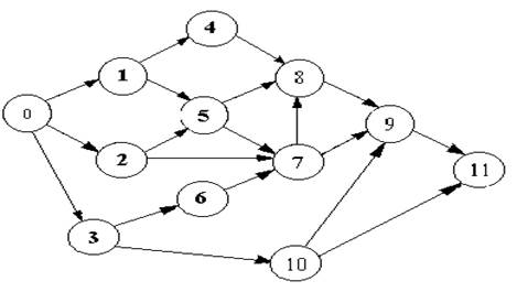 Припустимо, що при д-я. проекту виділено 12 подій: 0, 1, 2, 3, 4, 5, 6, 7, 8, 9, 10, 11. Нехай є 24 роботи, які їх зв’язують. Необхідно скласти сітьовий графік та упорядкувати його. Початкова подія – це подія 0. цій події не передує ніяка робота, а завершуючою подією є подія 11, за нею не має наступною роботи. Так як зміщення часу зліва направо перенесло подію 0 в ліву частину графіка, а подію 11 в праву частину, між ними розташовуємо проміжні події. Події зв’яжемо роботами (стрілочками) у відповідності з переліком робіт. Побудований графік задовольняє сформульовані правилом, але він не упорядкований.