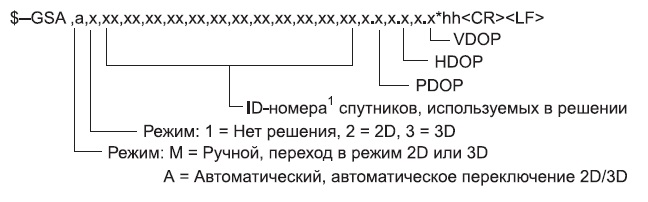 В одном GSV-сообщении передается информация не более чем для четырех спутников. При этом в каждом из кадров передается ID-номер спутника, угол места, азимут и SNR. Информация о других спутниках передается в другом сообщении. Количество сообщений и номер каждого из них содержится в первых двух полях. Следует обратить внимание на тот факт, что третий параметр в сообщении GSV «Общее количество видимых спутников» означает только то, что в данный момент времени приемник может наблюдать именно такое количество спутников. Однако этот параметр не определяет количество спутников, данные которых учитываются при расчете координат. Может случиться такая ситуация, что половина из всех видимых спутников будет находиться в «неудобной» геометрии, и сигналы от них будут слабые или искаженные. Параметр, определяющий количество спутников, по которым ведется расчет геодезических данных, называется «Количество спутников в решении». Этот параметр выводится в сообщении «GSA — геометрический фактор ухудшения точности и активные спутники». Он определяется исходя из геометрии расположения видимых спутников и качества их сигналов. Именно по этим критериям определяются спутники, которые будут участвовать в решении. Формат сообщения GSA показан на рис. 5.